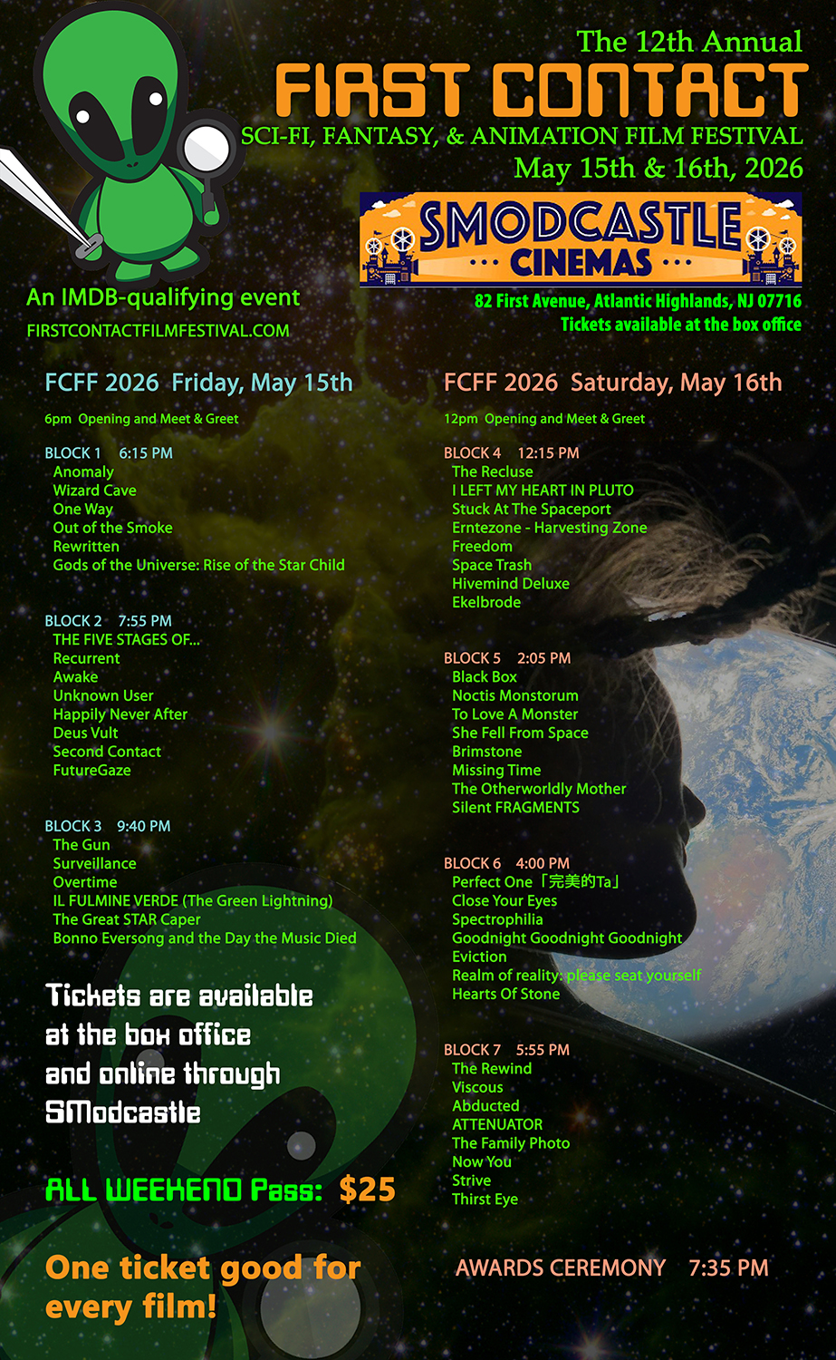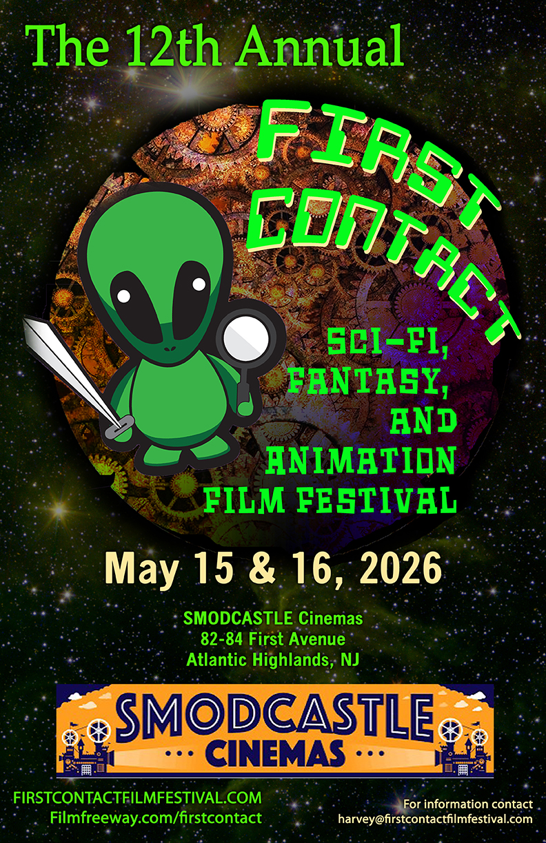 First Contact Film Festival is an annual, IMDB‑qualifying short‑film showcase held at Kevin Smith’s SModcastle Cinemas in Atlantic Highlands, NJ, celebrating the best in science fiction, fantasy, imaginative horror and magical realism . Now in its twelvth year, First Contact brings emerging and established filmmakers together to honor imaginative storytelling and award juried prizes across multiple categories . Whether you’re a filmmaker or an audience member, join us May 15th and 16th, 2026 for two days of genre delights and a community-powered celebration.